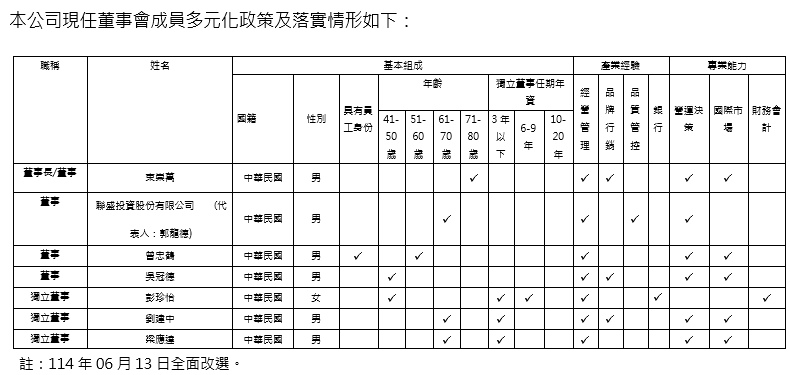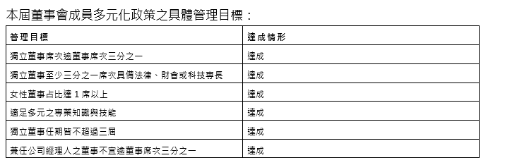 (1) 董事會組成多元化政策訂定於「公司治理實務守則」及「董事選任程序」。依本國公司治理實務守則第20條規定,董事會成員需普遍具備執行職務所必需之知識、技能及素養,